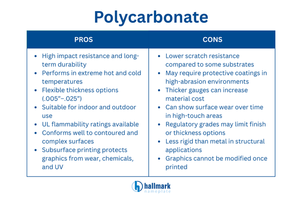 Polycarbonate delivers a rare combination of durability, flexibility, and visual performance, making it one of the most versatile substrates available for nameplates.